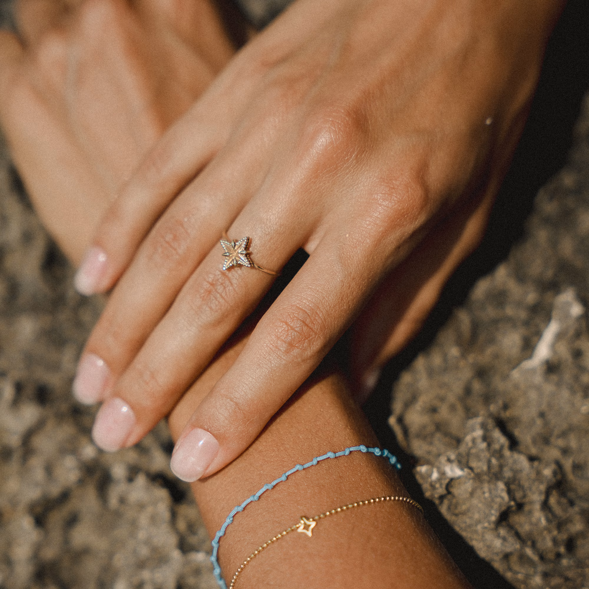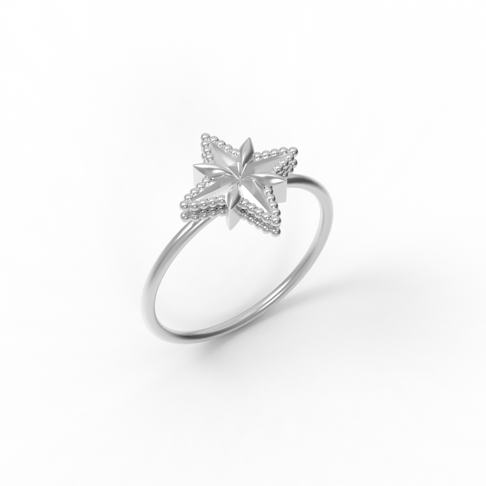 A luminous statement — compact in size, infinite in symbolism. The Radiant Ring features an intricately sculpted eight-point star, inspired by cosmic harmony and inner brilliance. Each facet is polished to perfection, framed by a beaded contour that adds subtle texture and dimension.